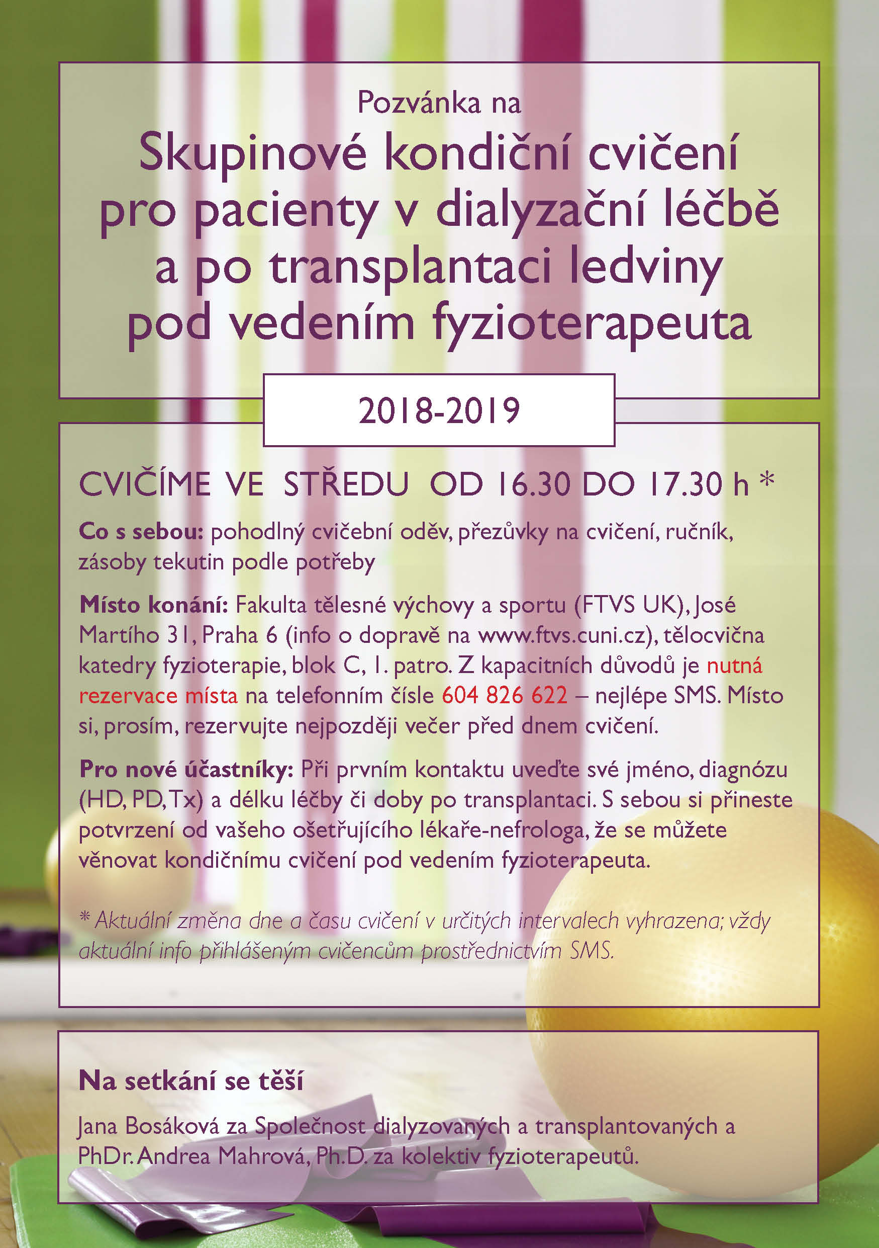 Na setkání se těší Jana Bosáková za Společnost dialyzovaných a transplantovaných a PhDr. Andrea Mahrová, Ph.D. za kolektiv fyzioterapeutů.